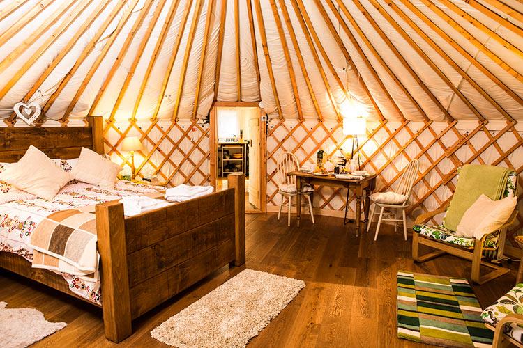 Set in seclusion among 10 acres of woodland, the Maythorn and Rowan Yurts really have been filled to the canvas-topped brims with comforts; inside, along with the super king-size bed, the yurts have not only a wood burning stove but also under floor heating for maximum cosiness.