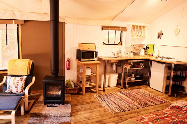 Deanwood Luxury Safari Tent nestles in a private corner of our woodland, with lovely views from the covered deck over our fields, hills and trees. It is the latest very high quality addition to our ‘glamping’ offer. The Safari Tent has an internal shower room with flush toilet and hot water on demand. It has a kitchen with gas oven hob and etc, a large king-size bed , log stove, comfy seating inside and out and, of course, and as with the yurts it has a private hot-tub on the deck. There is a free to use shared pool slot at 7pm each evening for 70 minutes or, given notice you can pre-book a private slot in the pool at a modest price. Ideal for couples.