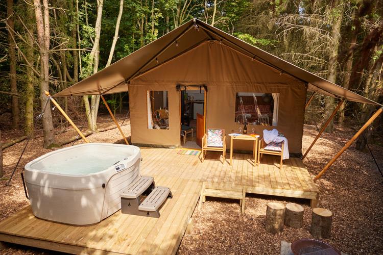 Deanwood Luxury Safari Tent nestles in a private corner of our woodland, with lovely views from the covered deck over our fields, hills and trees. It is the latest very high quality addition to our ‘glamping’ offer. The Safari Tent has an internal shower room with flush toilet and hot water on demand. It has a kitchen with gas oven hob and etc, a large king-size bed , log stove, comfy seating inside and out and, of course, and as with the yurts it has a private hot-tub on the deck. There is a free to use shared pool slot at 7pm each evening for 70 minutes or, given notice you can pre-book a private slot in the pool at a modest price. Ideal for couples.