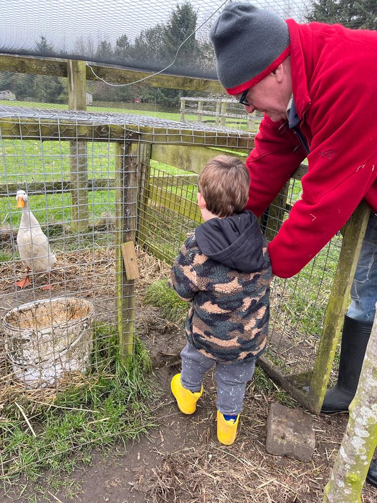 You are never too young to help with the hens, cows, ducks, geese, lambs, pigs and bantams. And yes, 'Rocking Ronnie' the rooster is still lording it around the farm
