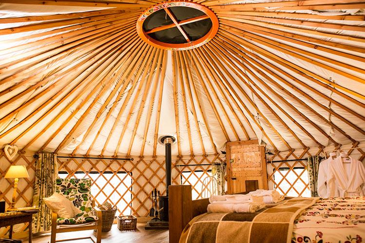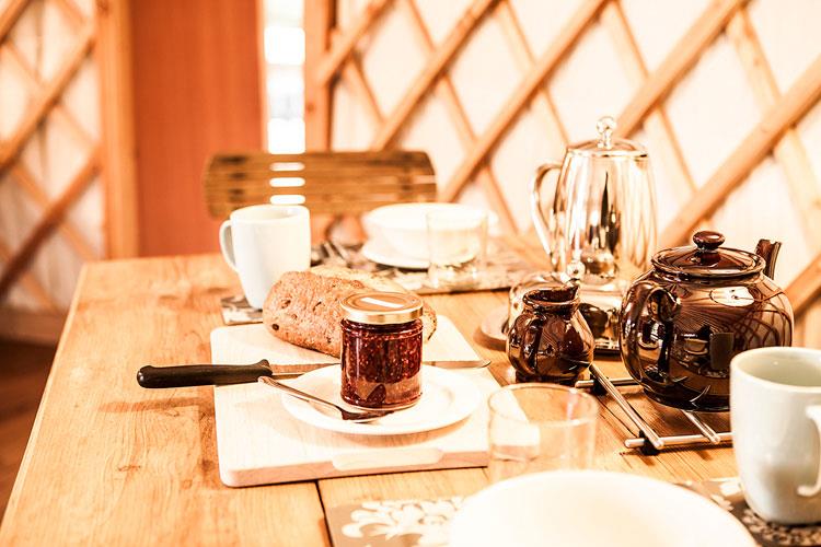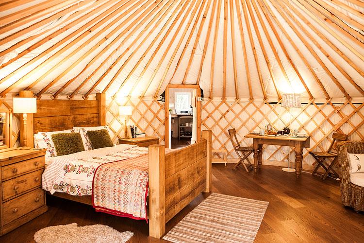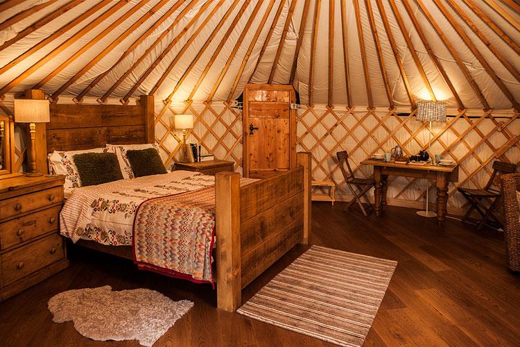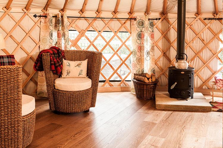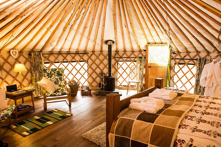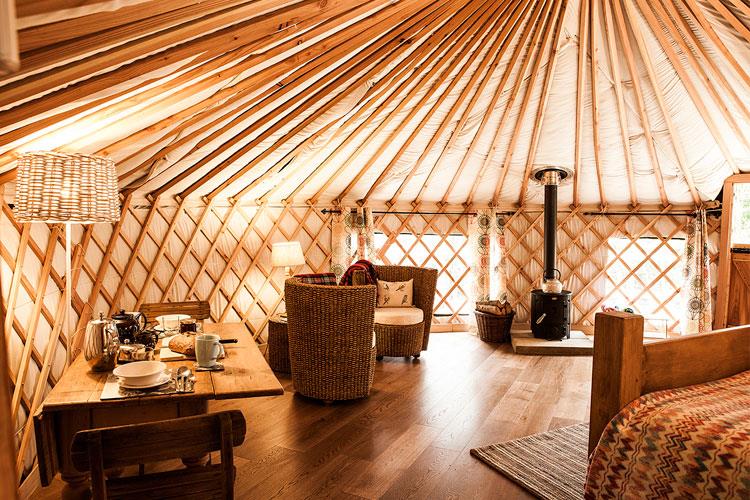 Set in seclusion among 10 acres of woodland, the Maythorn and Rowan Yurts really have been filled to the canvas-topped brims with comforts; inside, along with the super king-size bed, the yurts have not only a wood burning stove but also under floor heating for maximum cosiness.