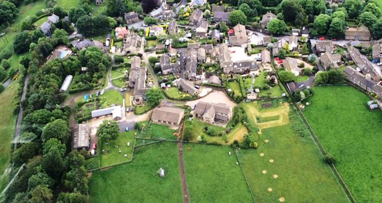 Uppergate Farm, the cottages, the pool and the start of the fields and woodland can be seen in the foreground of this aerial picture of Hepworth village